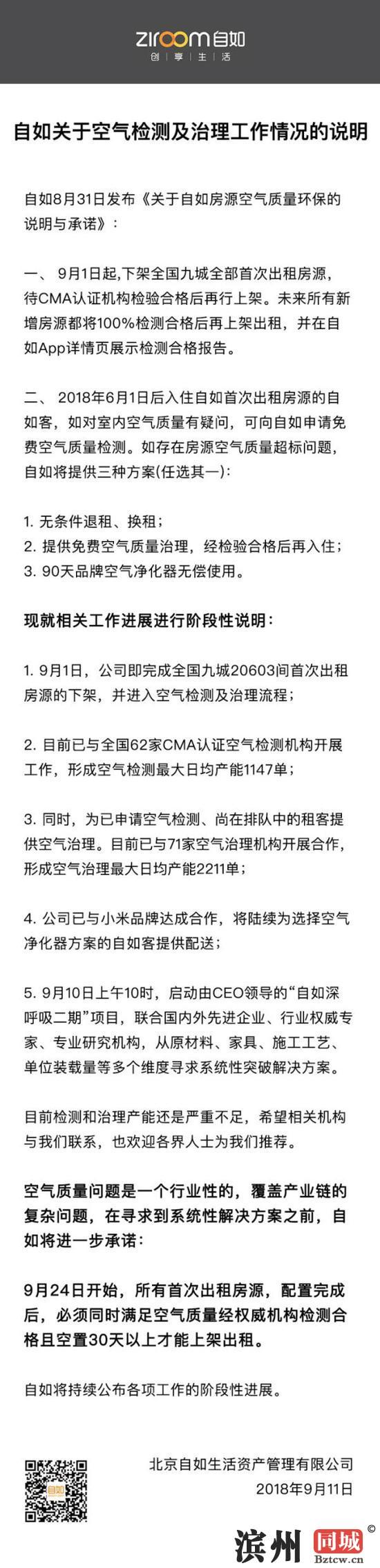 9月11日,自如微博发布关于空气检测及治理工作情况的说明。